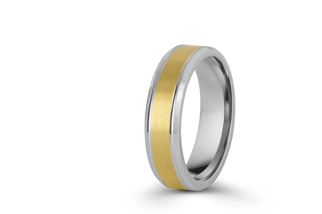 The band features a brushed gold inlay that stands out against the polished edges. The central gold band has a matte finish, offering a subtle contrast to the sleek, reflective borders. Offering classic style with a touch of modern flair.