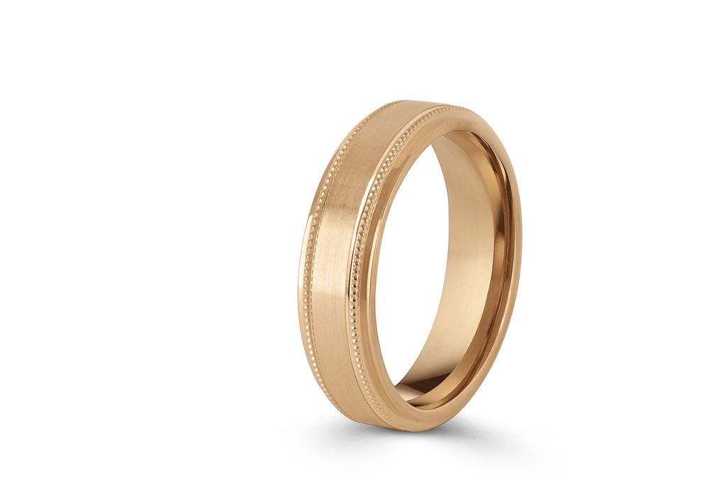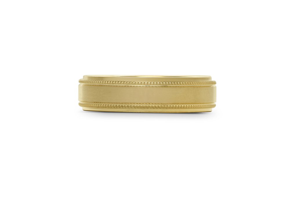 This wedding band embodies timeless elegance with its classic design. The ring features a wide brushed center band, providing a subtle matte finish that contrasts beautifully with the polished edges. The edges are adorned with intricate milgrain detailing. This band is perfect for those who appreciate traditional craftsmanship and a design that will never go out of style.
