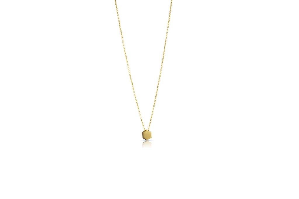 Refined hexagon charm suspended on a slender chain. Its geometric simplicity embodies elegance and modernity, perfect for layering or wearing alone. Ideal for those who appreciate understated elegance and contemporary design.