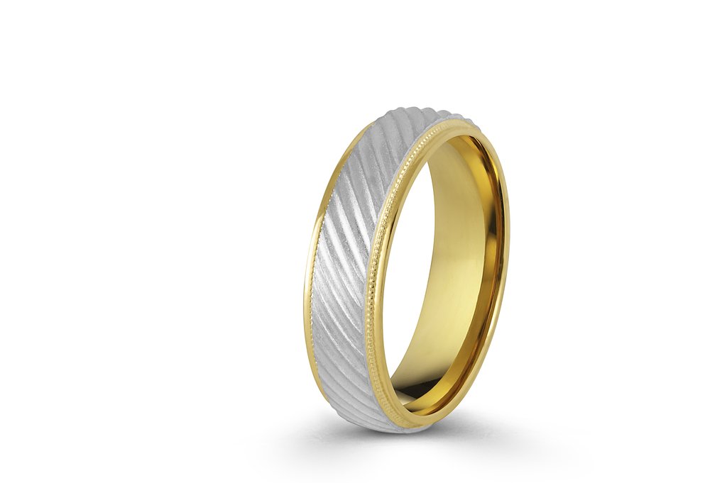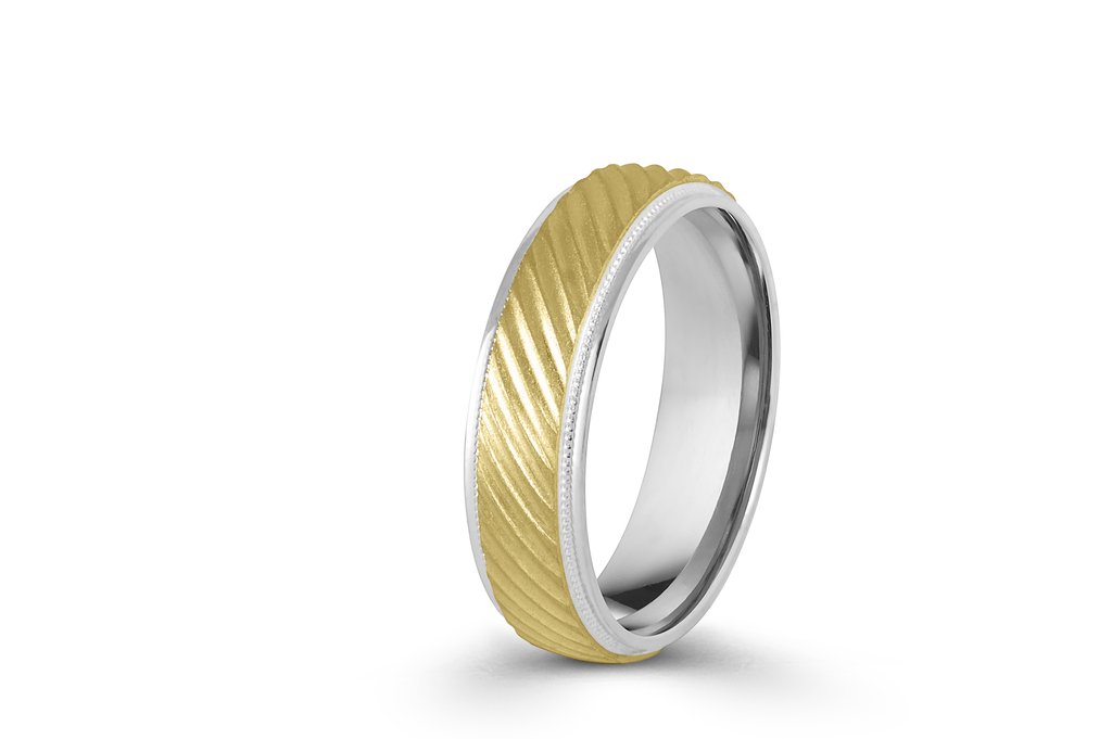 This wedding band combines modern design with classic details, featuring a striking diagonal wave pattern in a gold inlay that contrasts beautifully with the polished borders. The milgrain detailing along the edges adds a vintage-inspired touch, making this ring both unique and versatile, symbolizing a marriage of elegance and modernity.