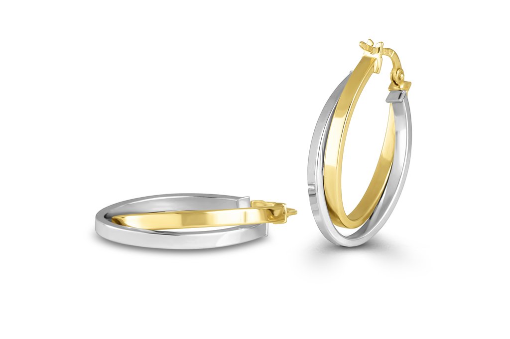 The perfect union of gold and silver. These stunning earrings feature intertwined bands of sleek gold and polished silver, symbolizing balance and unity. Perfectly balanced, they exude an enticing blend of elegance and boldness. Whether for a romantic evening or a glamorous event, these earrings promise to enhance your allure, leaving a lasting impression wherever you go.