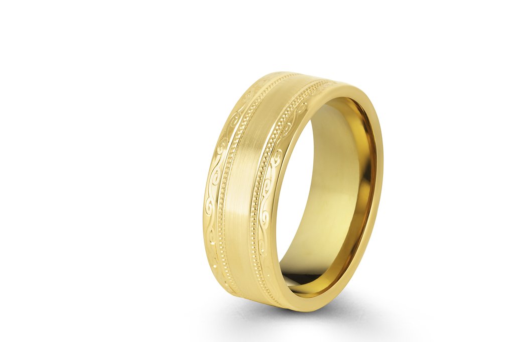 Masterpiece of timeless elegance. Crafted in rich, radiant gold, this band features intricate scrollwork and delicate beading, symbolizing a union of tradition and luxury. Its wide design offers a bold statement, perfect for couples who cherish heritage and style. Celebrate your eternal love with this unique and exquisite wedding band, a true reflection of your royal journey together.