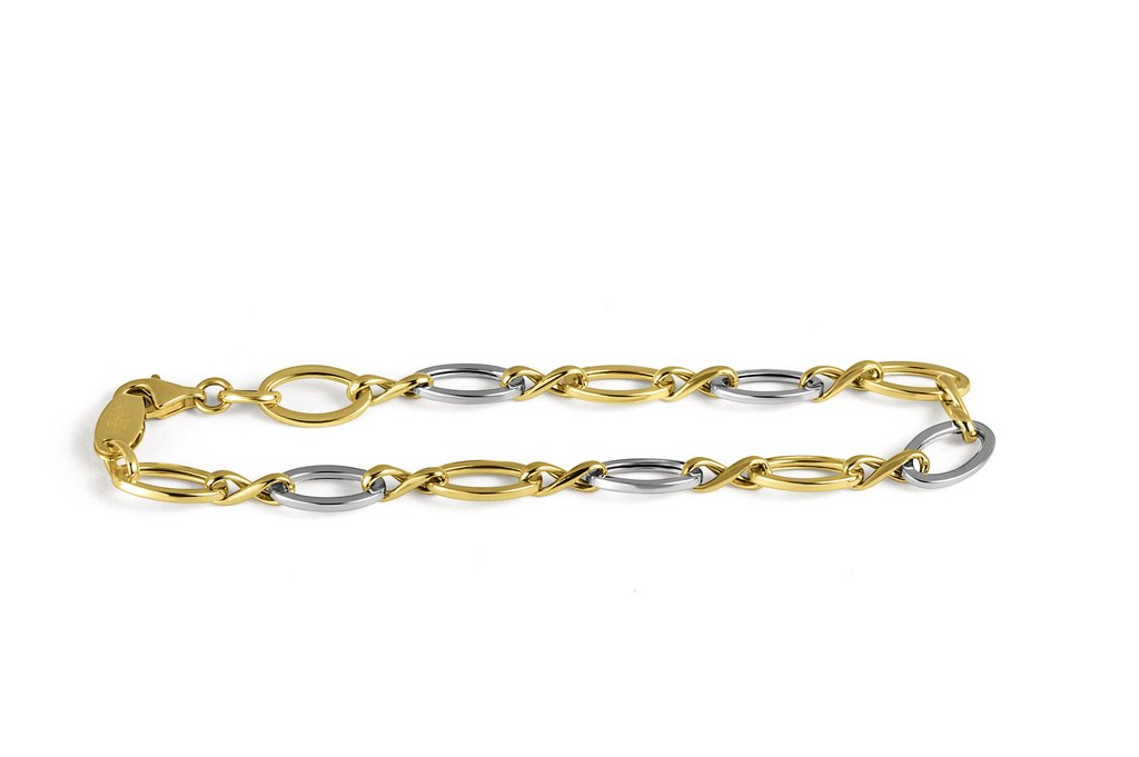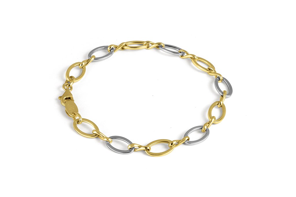 This elegant bracelet features interlocking gold and silver oval links, creating a striking contrast. The meticulously crafted design ensures a comfortable fit and secure closure. Perfect for any occasion, this timeless piece adds sophistication and style to your collection. A versatile accessory for both casual and formal wear.